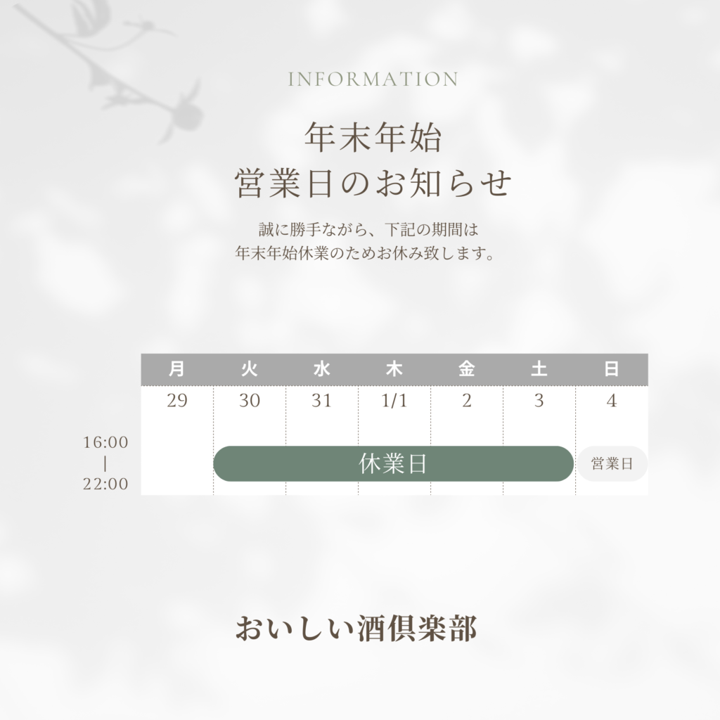 - 2025年12月29日 【年末年始のご案内】1月4日(日)から営業いたします。
